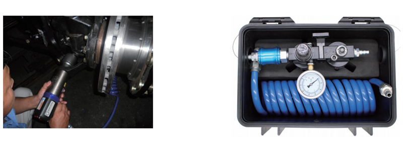 一臺氣動扭矩扳手的標準配置有:一支反作用力臂,一件固定反作用力臂與扳手連接的卡環,一根氣管,一塊壓力表,一只過濾器、調節器、注油器三聯套工具提籃。