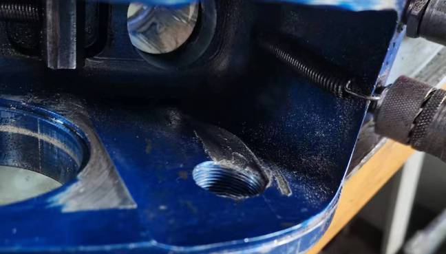 我們拆解檢查發現,改扳手的兩側驅動板在同一位置發生斷裂,油缸外沿刮擦缺損嚴重,殼體內腔出現嚴重刮削凹痕,整個扳手內部充滿金屬碎屑。從各部位損傷跡象我們可以推導出最先出現問題的應該是驅動板。長期高負荷運行或者使用過程中的受力不均導致液壓扳手驅動板出現損傷,但彼時并沒有達到非常嚴重的斷裂,扳手有些微卡但依然能夠轉動使用,導致操作人員沒有及時發現和處理。但這個時候裂痕使得驅動板不再光滑,并與殼體及油缸外沿產生接觸和刮削嚴重損傷了油缸和殼體。同時,刮擦下來的金屬碎屑又在運動中進入棘輪棘爪,對棘輪棘爪也造成了不小傷害。本來只用更換驅動板,卻差點毀了整個扳手。