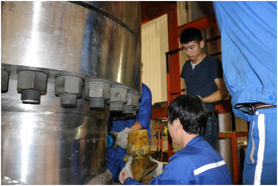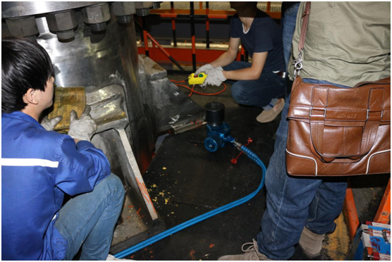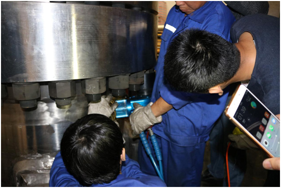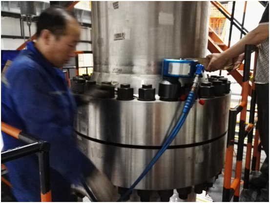 現(xiàn)場工作人員非常認真地與波霆機械工程師進行交流、探討以及學(xué)習(xí)液壓扳手的正確操作方法。培訓(xùn)剛剛結(jié)束大家就開始忙碌起來,對應(yīng)兩個法蘭現(xiàn)場工人分成兩組,每組三個人,采用兩同步拆卸螺栓。