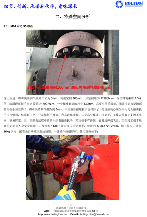 業(yè)主方之前從武漢購(gòu)買過(guò)一套德國(guó)品牌液壓扳手,使用情況并不理想,由于液壓泵和開口液壓扳手較為笨重,故不考慮。