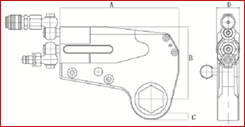 中空液壓扳手的局限性也有,比如說有些使用單位希望用一個工作頭來實現(xiàn)多種工況螺母工作,這個時候他們會選擇襯圈增加使用范圍。但是,增加襯圈會增加工作頭的厚度,也就是下圖中的C值變大: