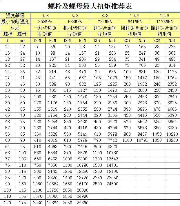 扭矩是驅使物體發生轉動的一種特殊力矩,在功率固定的條件下它和轉速呈反比關系,轉速越快扭矩就越小,反之則越大。BOLTING機械為了讓廣大用戶更好的使用液壓扳手,下面這張螺栓螺母扭矩值推薦表,有需要的朋友一定要收藏哦,這張對照表格能夠讓用戶在使用液壓扳手時更快速的知道適合哪種型號的液壓扳手。