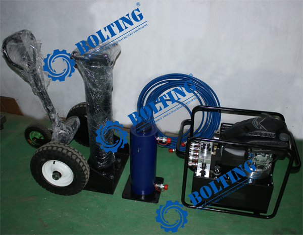 近日為河南某重工企業定制的移動式液壓駕車機準備發貨,因客戶現場工況受限,采用汽油發動機動力液壓泵作為動力源,配備移動駕車機,50T通用型雙作用液壓千斤頂和10m的雙聯液壓油管,簡便快捷的解決了重物頂升問題。