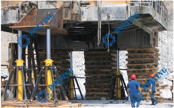 已知所需頂升設(shè)備為礦用電鏟,對電鏟進行回轉(zhuǎn)支承維護等工作,總重量約為1000噸,需更換履帶行走裝置、回轉(zhuǎn)裝置等部件,就需要將整機同步頂升,平穩(wěn)的頂起到一定的高度,便于現(xiàn)場的檢修,頂升過程中需保證不損壞整機結(jié)構(gòu),也需使其均衡受力。